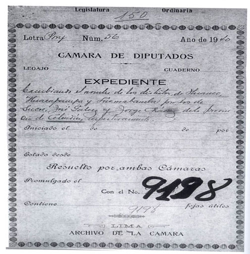 La Ley Nº 4860 de 27 de diciembre de 1923 dice: “El distrito de Huauco se compondrá de los caseríos Conga de Urquia, Colonga y Cajén”.