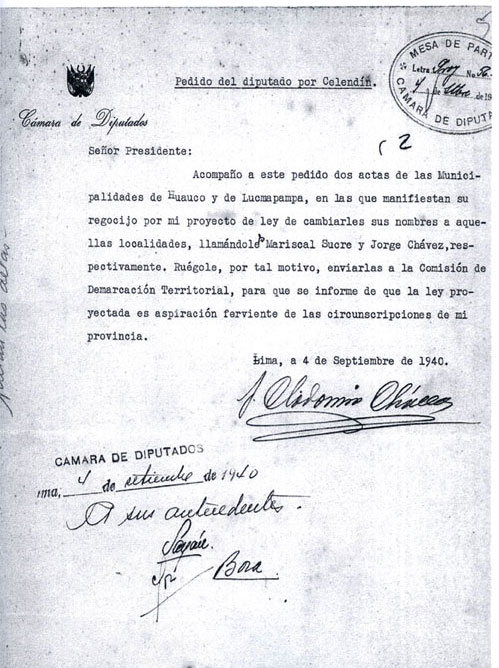 Chávez también, de manera inconsulta cambió el nombre del distrito Huacapampa a José Gálvez y, del distrito Lucmapampa a Jorge Chávez.