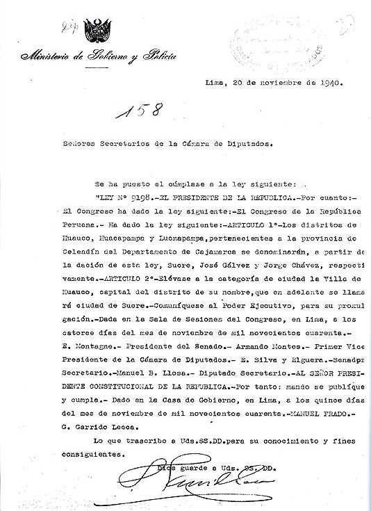 El 14 de noviembre de 1940, de manera inconsulta con la población del Huauco, el diputado por Celendín, Clodomiro Chávez Mariñas, consiguió que el Congreso de la República expidiera una ley cambiándole de denominación, dándole el de distrito de Sucre, bajo pretexto de homenajear al mariscal de Ayacucho.